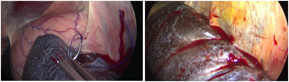 L’intervention est effectuée sur cheval debout sous sédation. Deux canules classiques et une grosse canule de 25 mm de diamètre sont utilisées. Une suture continue est réalisée permettant de juxtaposer la rate et le fascia péri rénal sous contrôle de la caméra.